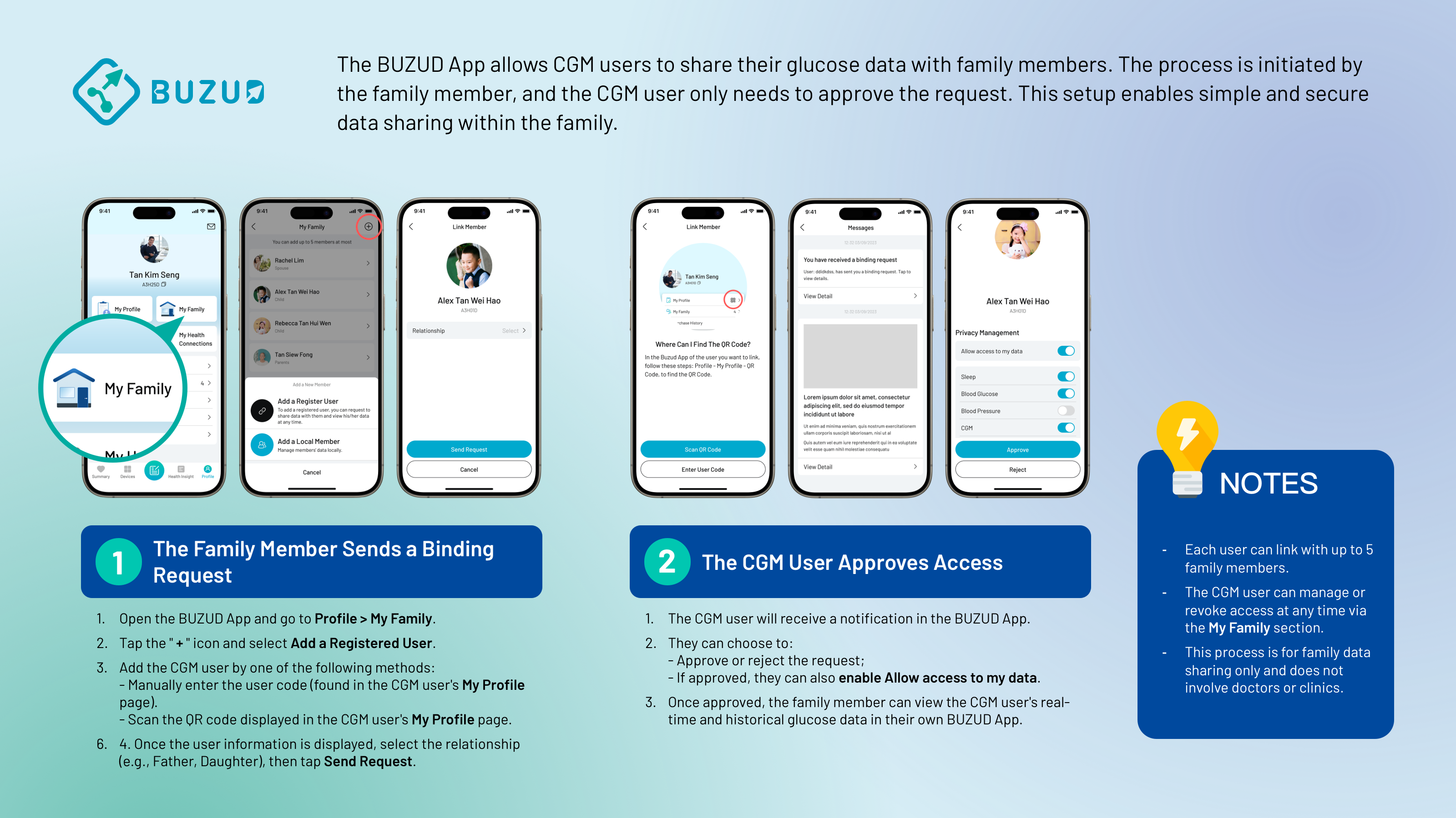 - Once approved, the family member can view the CGM user's real-time and historical glucose data in their own BUZUD App.